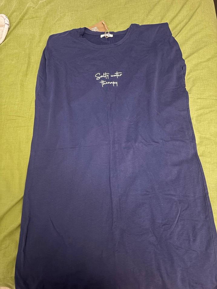 Kısa kollu, yuvarlak yakalı, bol kesim lacivert.baskılı yazılı ve yan yırtmaçlıdır. Günlük kullanıma uygundur. Hiç giyilmedi.