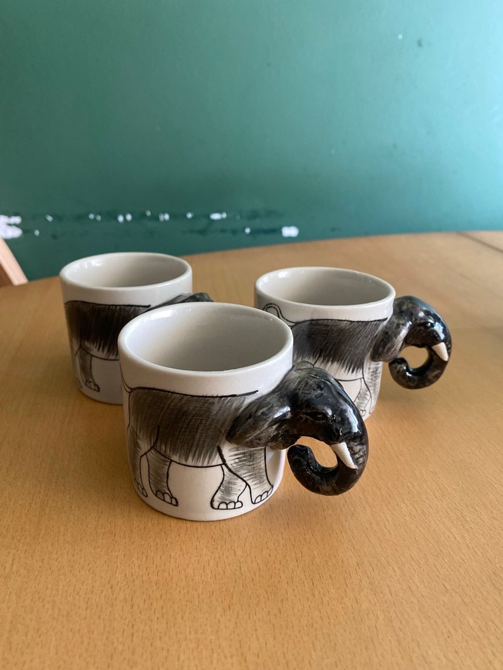 Fil figürlü, hortum şeklinde kulplara sahip gri seramik fincan seti.