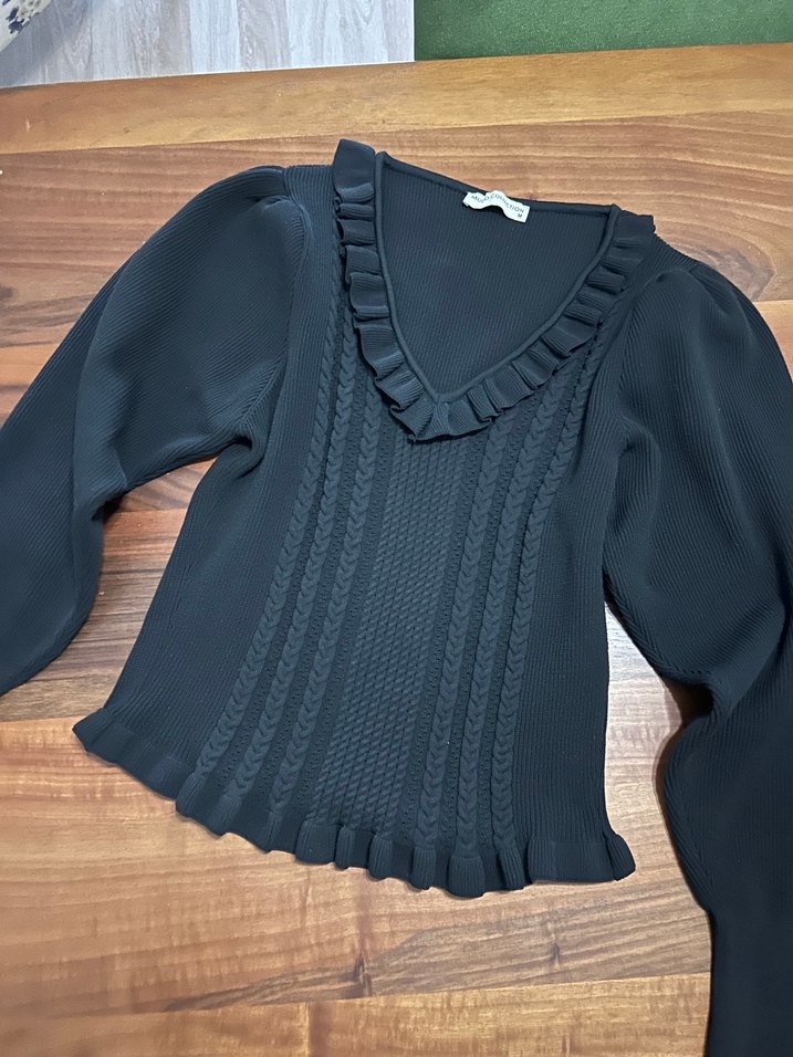 Fırfırlı V yaka ve uzun kollu, siyah triko bluz. Az giyilmiştir herhangi bir defosu bulunmamaktadır