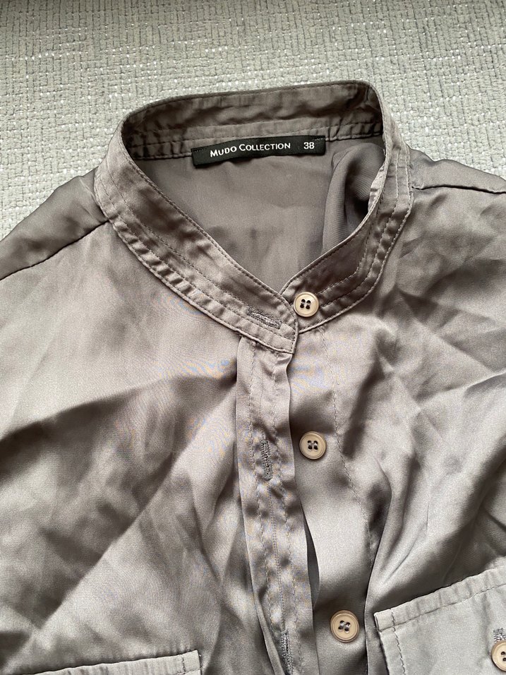 Gri keten kadin gömlek, uzun kollu ve düğmeli yakaya sahiptir. Rahat kesim ve normal boy uzunluğundadır, günlük kullanım için uygundur.