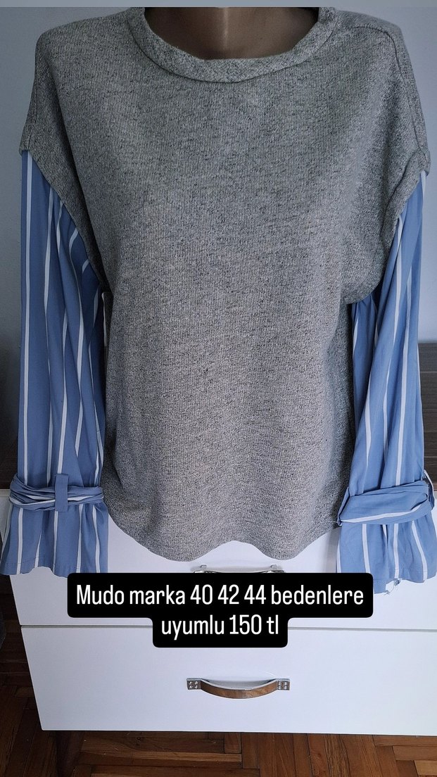 Mudo marka, gri triko detaylı, uzun kollu, salaş kesim ve yuvarlak yakalı kadın gömlek, günlük kullanıma uygundur.