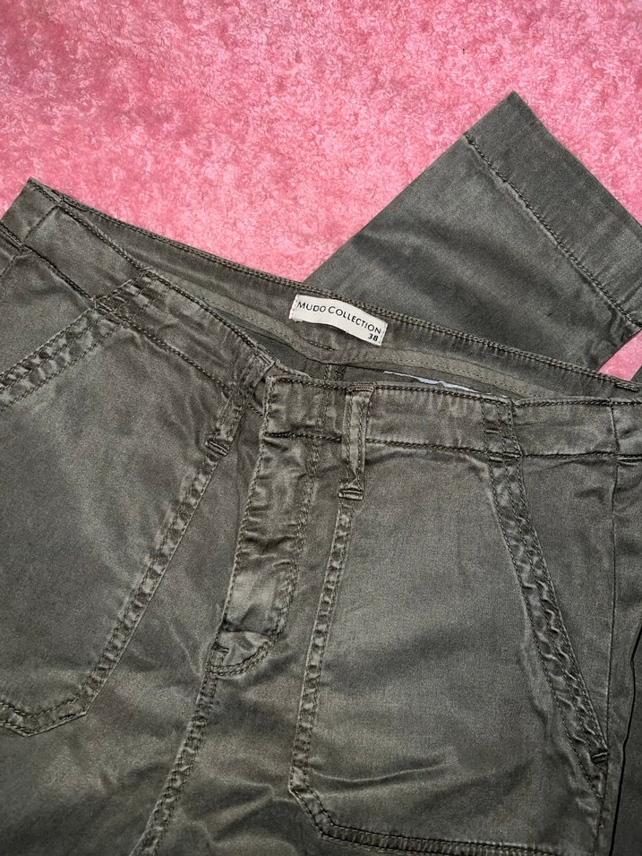 Haki renkte, düğmeli, normal boy midi uzunluğunda, loose fit kesime sahip kadın kot pantolon. Günlük kullanıma uygun sade ve rahat tarzda.