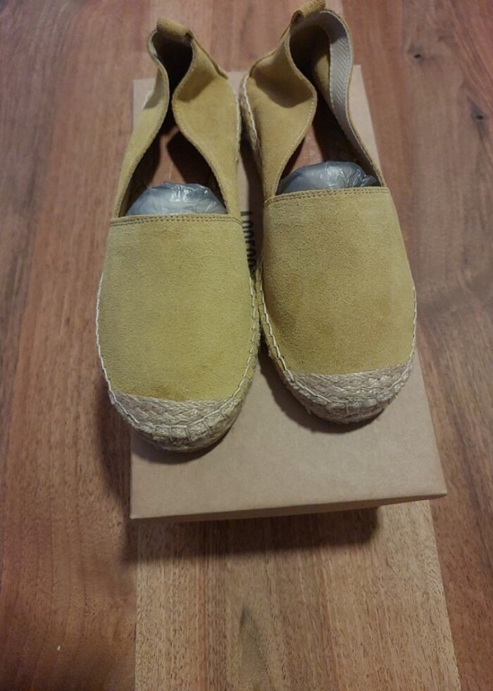 1 kere dışarida giydim ayagima kucuk geldigini farkettigimde artik giymiş bulundum dışarıda sonra hic giymedim ufak nokta kadar lekeleri var ama suet derisinden dolayi inanin belli bile olmuyor eger ufak lekeleri sorun yapacak varsa almasın lütfen. cok temiz sorunsuz kutusu ile gonderim yapacagim 37 numara fakat 36-36.5 numaraya daha iyi olur onun icin 36 numara işaretledim. isteyene taban olcusu veririm. rengi safran olarak geciyor hardal rengindedir. #mudo#mudokadınespadril#kadinespadril#espadril#mudoayakkabı#mudoespadril#orjinalmudo#mudoaccessories