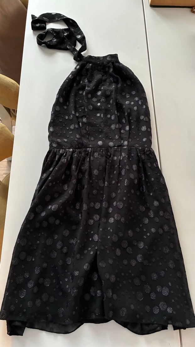 Kadın siyah uzun yüksek yaka ve askılı kollara sahip, zarif parlak benekli dokusu ile dikkat çeker. Şık ve sırt dekolteli gece kıyafeti.