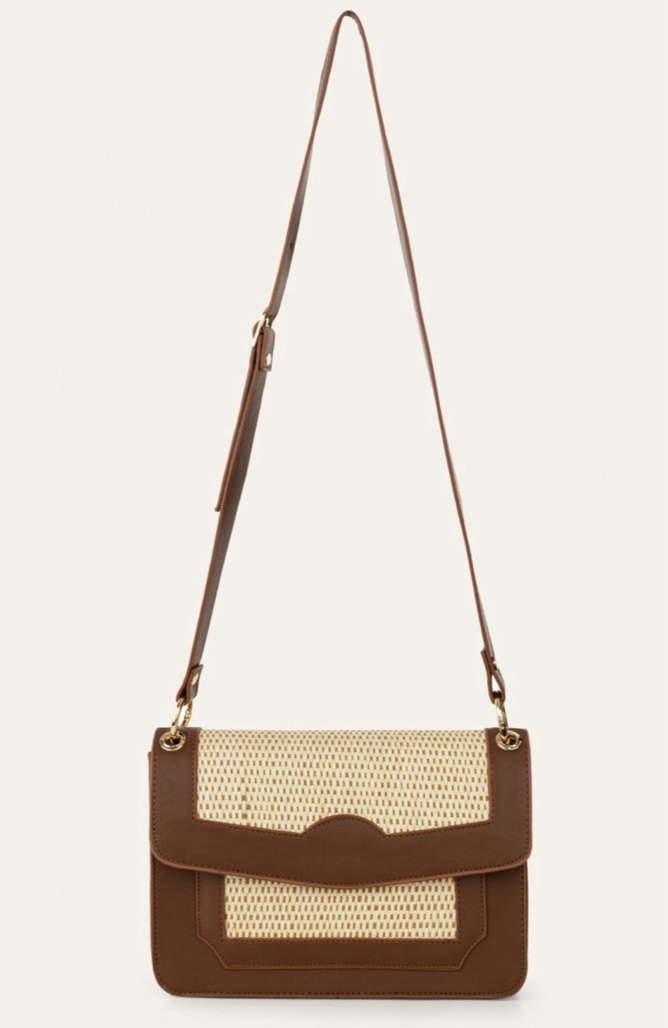 Mudo kahverengi deri çanta, bohem tarzda, günlük kullanıma uygun, koyu tonlu ve desensiz yüzeye sahip.