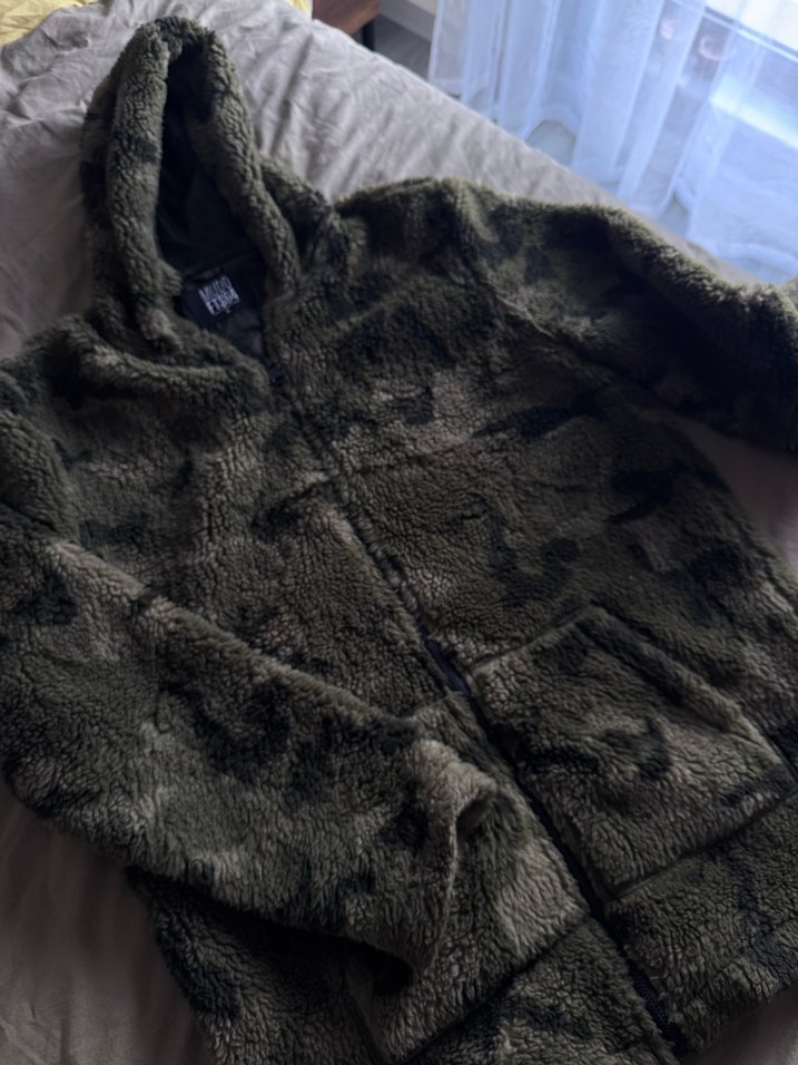 Kapüşonlu, uzun kollu ve normal kesim erkek polar. Kamuflaj desenli, yumuşak ve sıcak kumaştan, kürk detaylı. Haki renkte, normal midi boyda, trend ve rahat tarzda. İç astarı %100 polyesterdir.