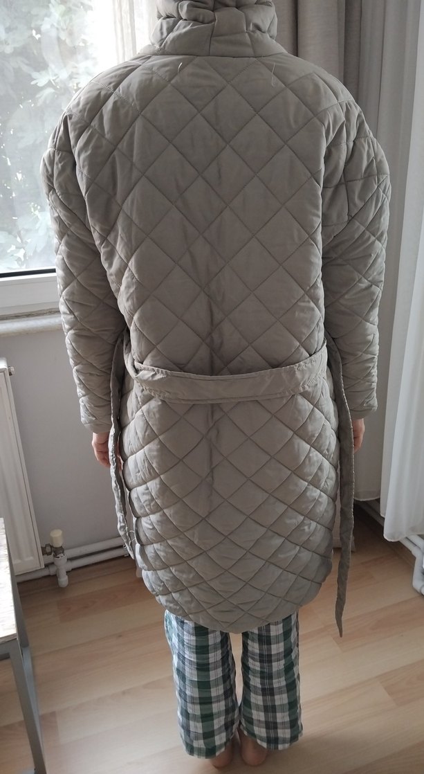 Yeşil renkli, kemerli ve kapitone desenli kadın kaban. Sentetik kumaştan, bol kesim ve yakası kesik detaylıdır. Rahat ve gündelik kullanıma uygundur.