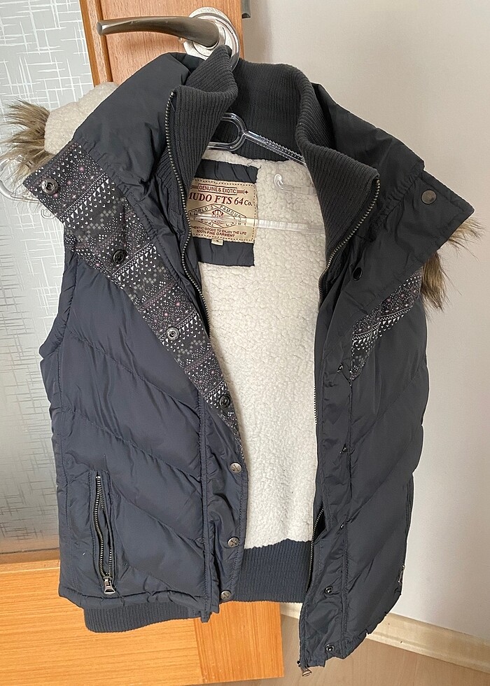36 beden füme gri içi kürklü 36 beden mudodan aldığım bir yelek. İsterseniz takılıp çıkarılabilen fermuarlı bir kapüşonu da mevcut. Sıcacık tutar.