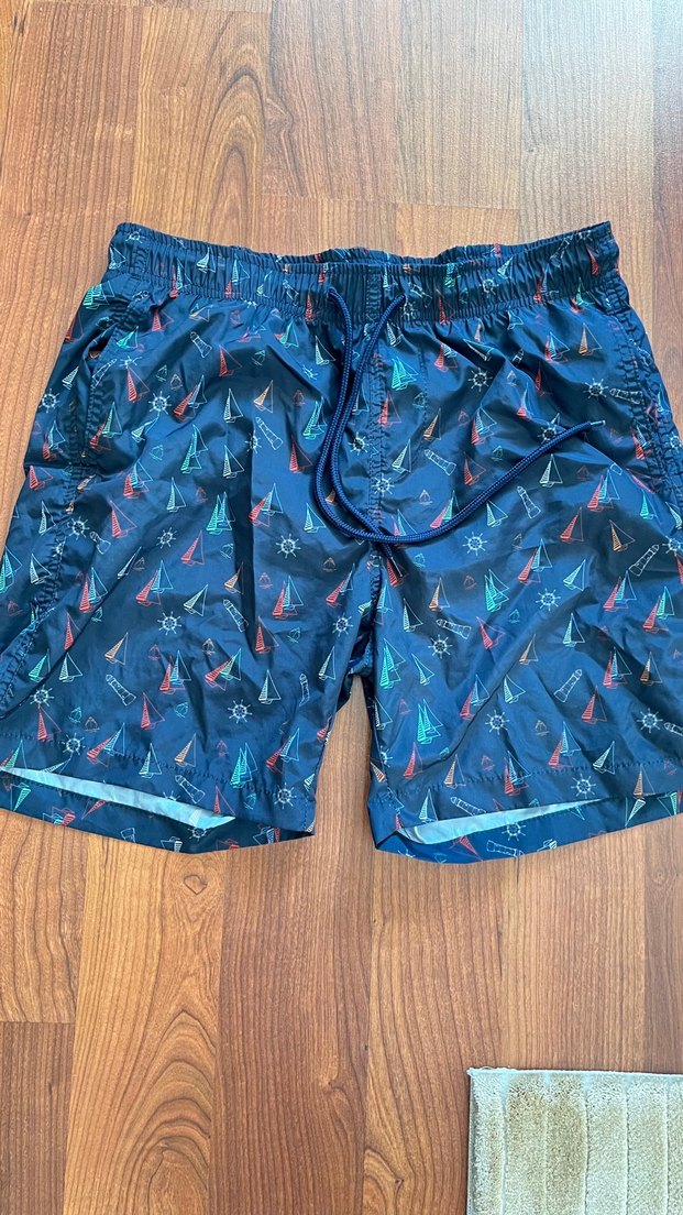 Lacivert renkte,cepli yelken desenli erkek şort. Rahat kesimiyle plaj ve günlük kullanıma uygun.sadece bir kez giyilmiştir hiçbir deformesi yoktur