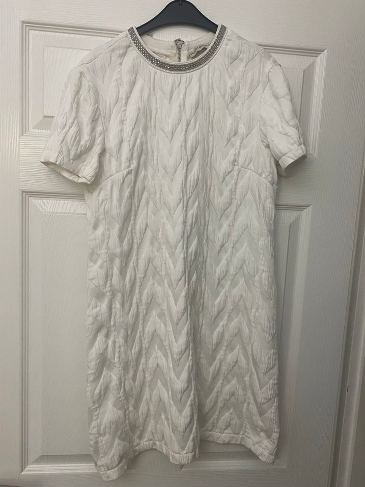 Mudo marka 36 beden Kadınlar için kısa kollu, yuvarlak yakalı, kumaşı deseni ve kabartmalı tasarıma sahip elbise. Rahat kesimli, midi boy ve günlük kullanıma uygun sade beyaz renktedir.