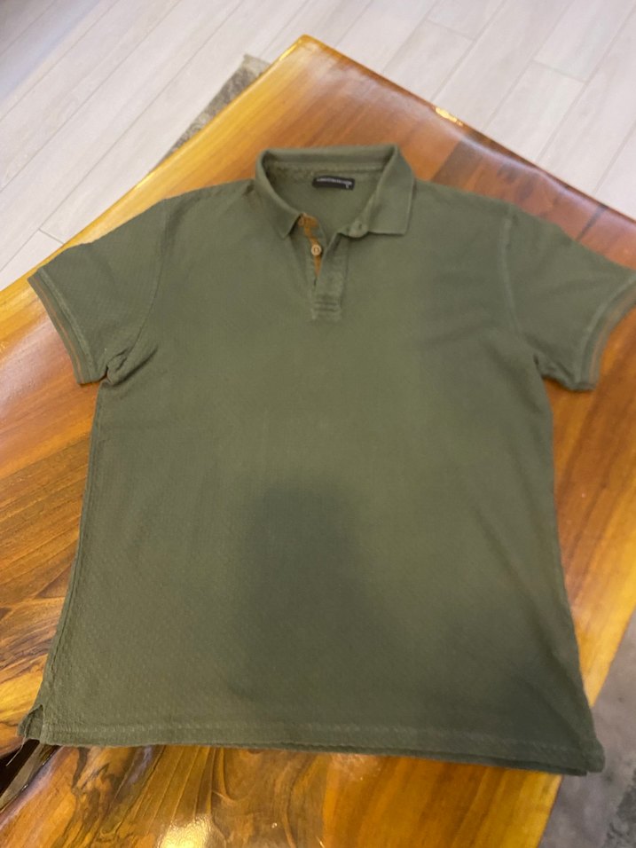 Mudo marka Haki Kısa Kollu Polo yaka Tişört L beden boy 70 cm iki koltuk altı arası 57 cm,yakasının arka kısmı süettir %100 pamuktur ve yedek düğmesi vardır renkte hafif solma var