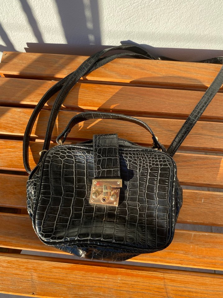 Siyah yılan desenli deri kadın çantası, tokalı kapama ve uzun omuz askısıyla günlük kullanıma uygun kompakt tasarıma sahip. İçinde bir tane fermuarlı göz bulunmakta ve fermuarlarda sorun yoktur. Arkasında minik bir cebi bulunmaktadır.
