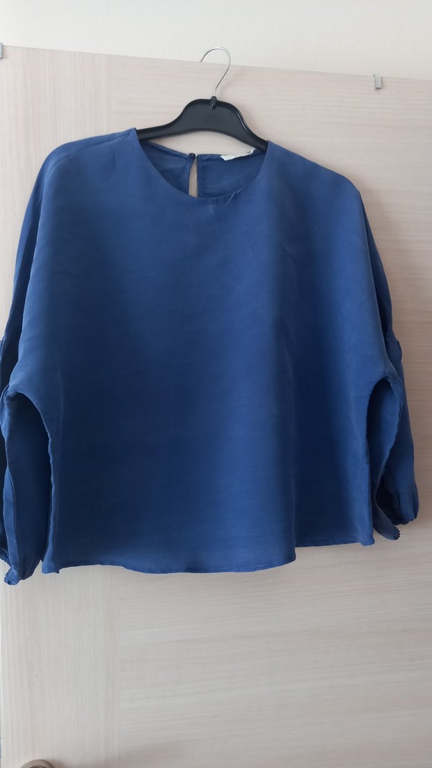 Parlak mavi, yuvarlak yakalı, uzun kollu, salaş kesim, saten dokulu, drapeli kadın bluz. Minimalist ve günlük kullanıma uygun.M beden ilede uyumludur.Ufak bir defosu var son resimde yakından cektim.