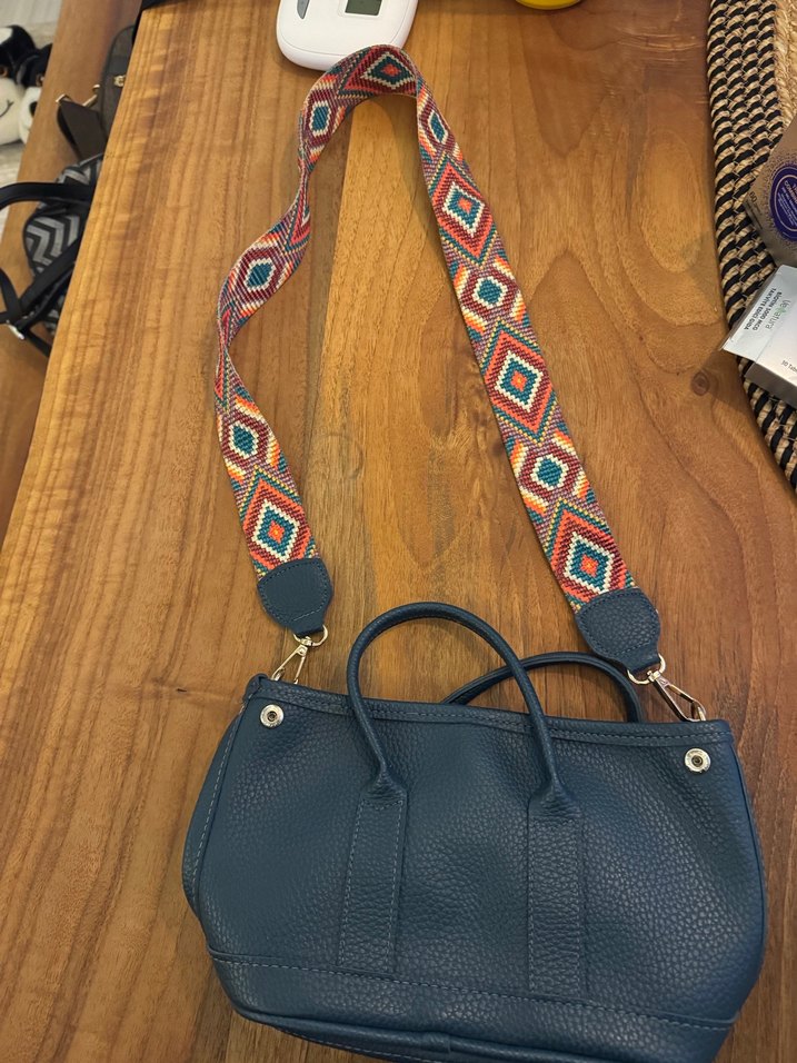 Petrol rengi çanta, tokalı kapama ve renkli geometrik desenli dokuma askıya sahip, günlük kullanım için uygundur.