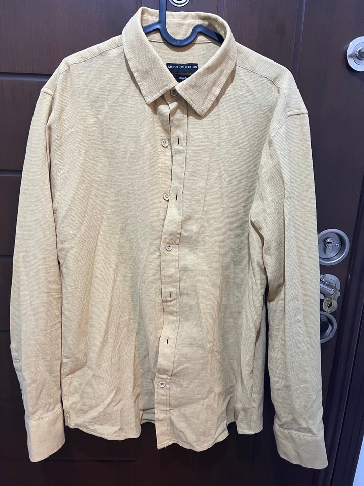 Sarı renkli, uzun yakalı erkek gömleği. Normal boy ve rahat kesim, ofis için uygun casual tarzda.