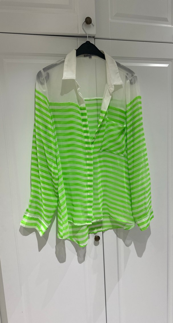 Uzun kollu, yakalı ve salaş kesimli kadın gömlek. Şeffaf sentetik kumaş üzerine açık yeşil şeritli, modaya uygun sokak stili gömlek. Hiç giymedim