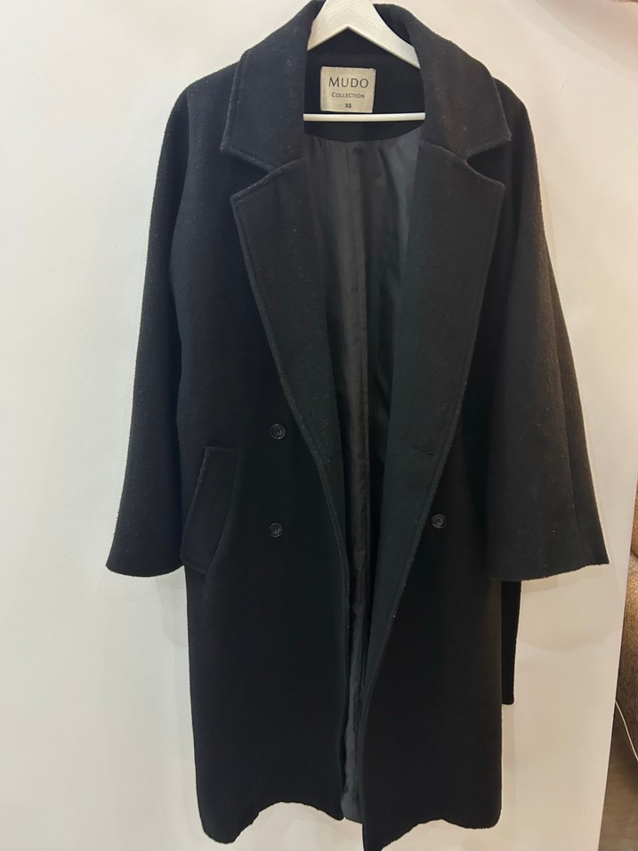 Mudo markasına ait siyah uzun kaban, çift düğmeli ve yaka detayıyla dikkat çeker. Yan cepleri ve iç astarı mevcuttur.