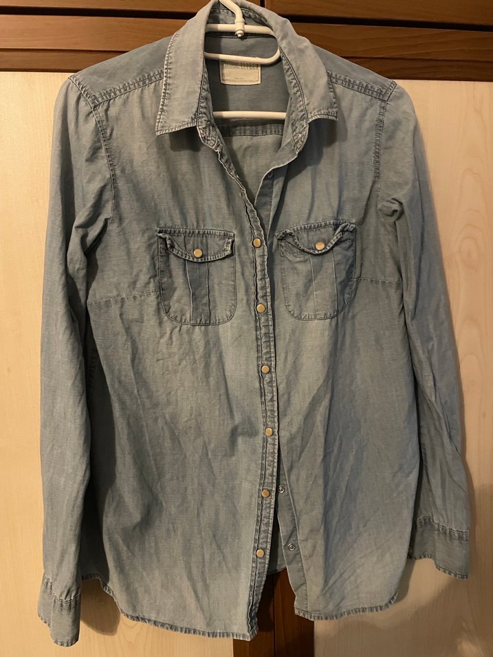 denim kumaştan, uzun kollu ve yakalı, düğmeli, bol kesim günlük sokak stili kadın gömlek.