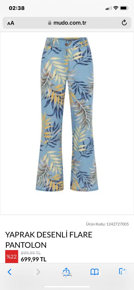 Yaprak desenli, mavi, bol kesim flare pantolon. Pastel tonlarda, pileli ve yumuşak sentetik kumaştan, bohem plaj stiline uygun. Ürün sadece 1 kez kullanıldı 40 beden olup 38 beden ile uyumludur.