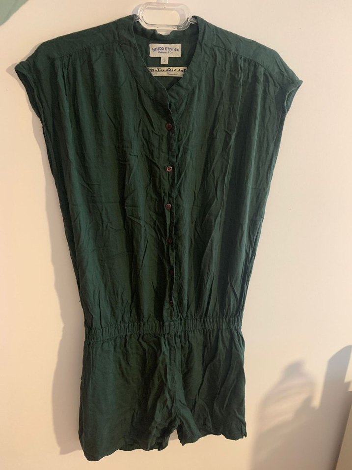 Koyu yeşil, düğmeli, kısa kollu, bol kesim mini şortlu kadın tulumu. Bohem vintage tarzını yansıtır. Uzunluk:81cm Genişlik :45cm