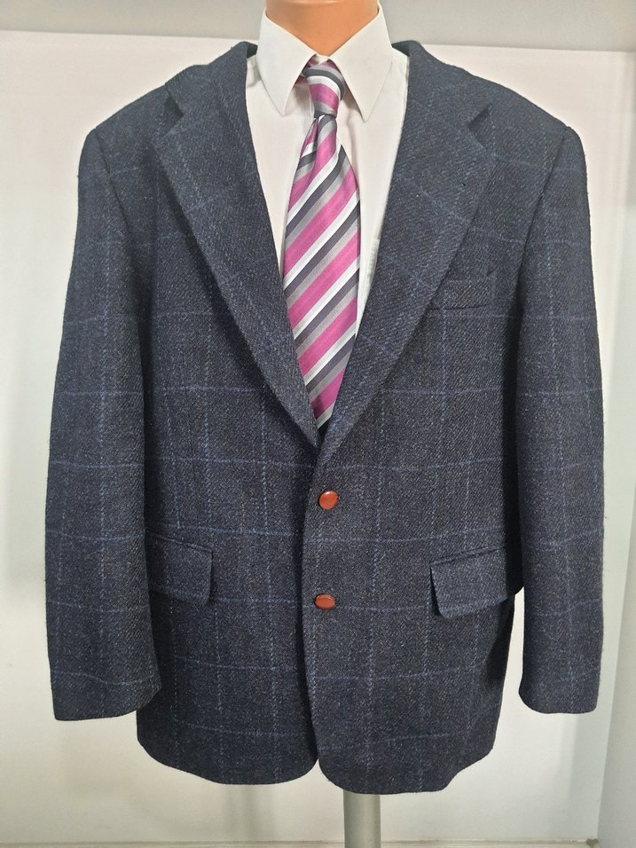 #mudo #ceket lacivert ekose renkli, yün kumaştan yapılmış erkek ceket. Normal kesim, ofis kullanımı için uygundur. kusursuz. koltukaltı en 60 cm. omuz ortadan boy 81 cm. omuzdan kol uzunluğu 65 cm. gömlek ve kravat dahil değildir.