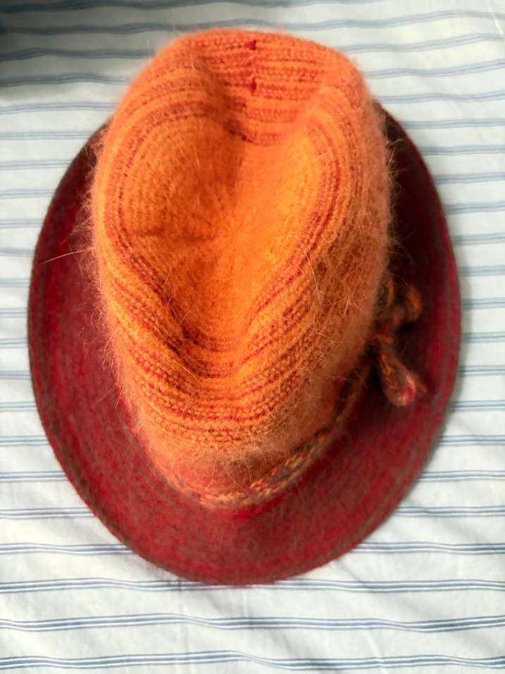 Canlı kırmızı ve turuncu tonlarda, yün örgü bohem tarzda kadın şapka. Retro ve hippie havası taşıyor. Hiç kullanılmadı
