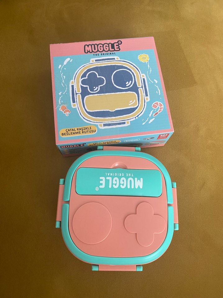 Pastel pembe renkte Muggle beslenme kutusu, çatal ve kaşık bölmeli, yemekleri düzenli tutmak için uygundur. Yeni ve kutulu