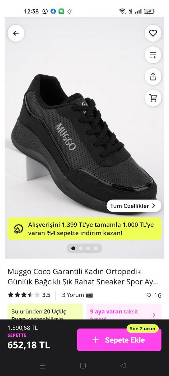 Muggo siyah kadın spor ayakkabısı, ortopedik destek ve rahat bağcık ile velcro özelliklerine sahiptir. Stiletto topuklu, kauçuk tabanlı ve şık spor tarzına uygundur. 1 kere giyinildi ihtiyaç fazlası