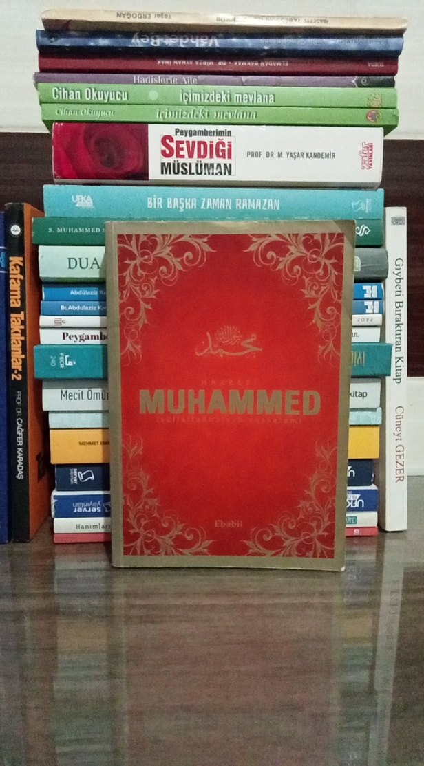Kırmızı kapaklı, altın desenli "Muhammed" adlı dini kitap, İslami öğretileri içerir.