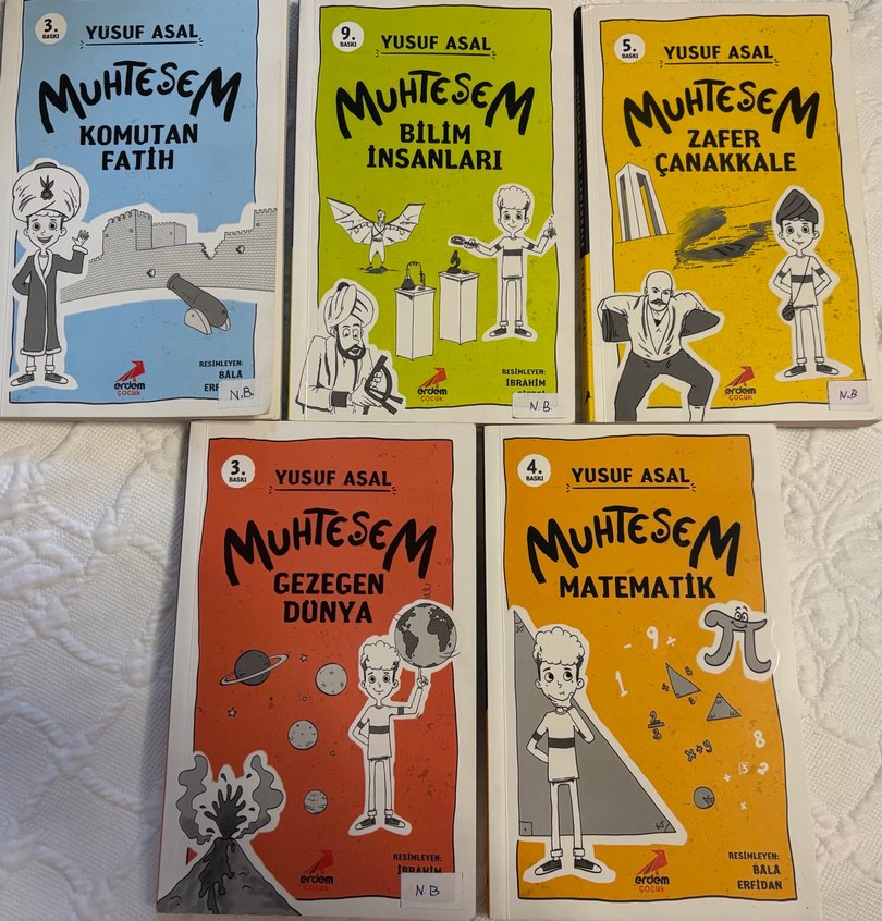 Yusuf Asal'ın çocuklar için gezegenler, dünya, matematik, insan vücudu ve bilim insanları konularını işlediği 5 kitaplık set. Etiketleri sökmedimki zedelenme olmasın. Siz üzerine etiket yapıştırabilirsiniz. 140ar sayfa. 4.sınıflar için uygundur. 1er kez okunmuştur. Muhteşem Serisi 5 Kitap - Yusuf Asal
