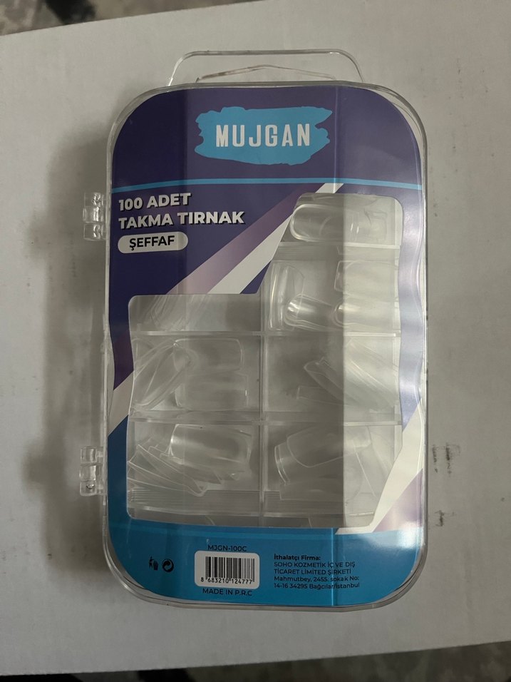 Mujgan markasına ait 100 adet şeffaf takma tırnak, mavi ambalajında sunulmaktadır. Doğal görünüm sağlar.