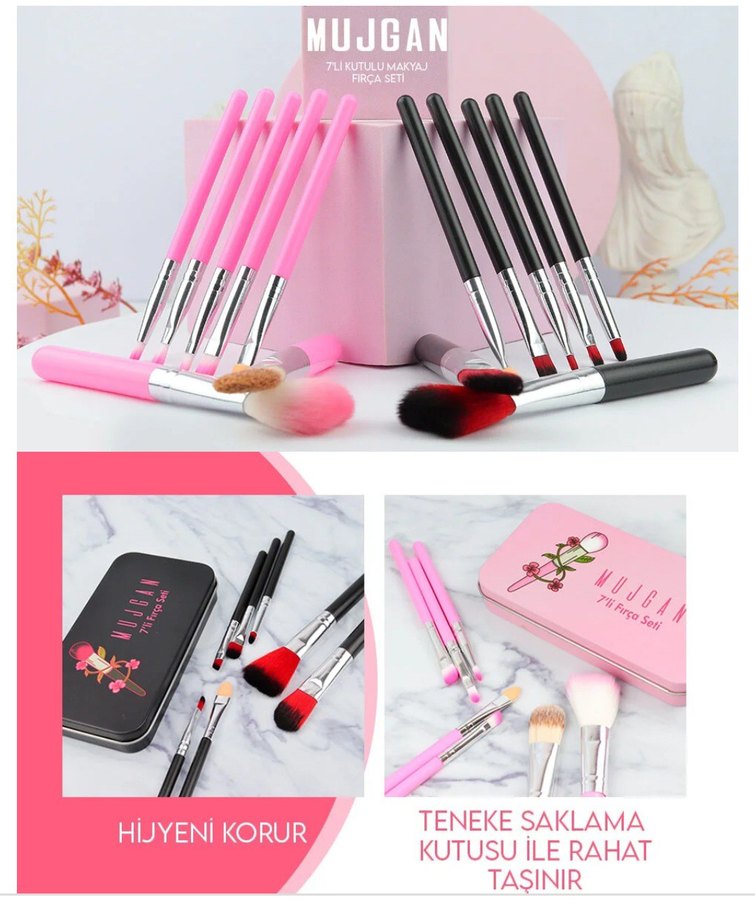 Mujgan 7'li fırça seti metal kutulu siyah ürün içeriği; 1 adet metal fırça kutusu 1 adet allık fırçası 14 cm 1 adet ince kontür fırçası 10 cm 1 adet klasik far fırçası 7 cm 1 adet aydınlatıcı fırçası 7 cm 1 adet far dağıtma fırçası 7 cm 1 adet far karıştırma fırçası 7 cm