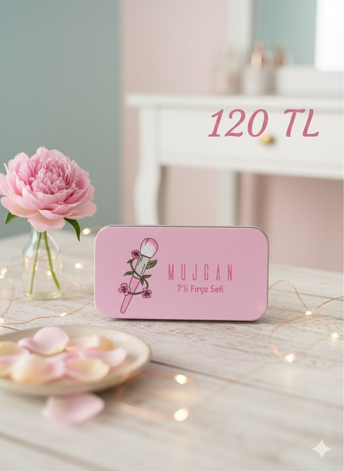 Mujgan 7'li pudra fırça seti, pastel pembe kutusunda sunulur. Yumuşak fırçalarla pudra uygulaması için uygundur.