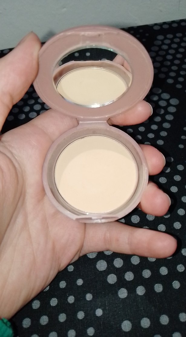 Pastel tonlu bej kompakt pudra, uygulama için dahili aynaya sahip.