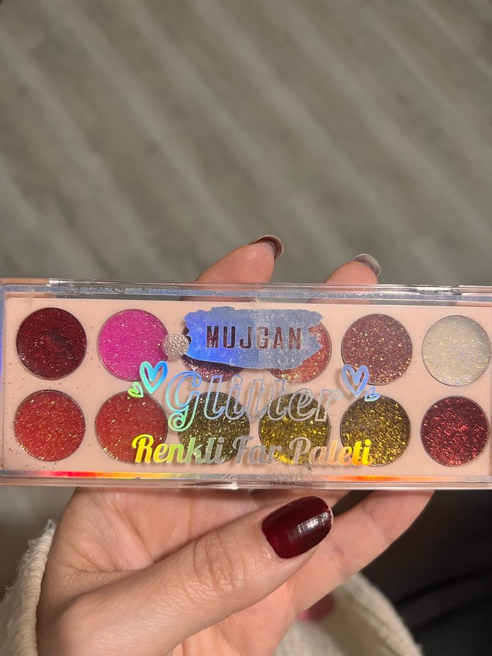 Mujgan markasının çok renkli, ışıltılı ve canlı tonlardan oluşan far paleti, makyajınıza parıltı katmak için ideal. ✨ Sadece kırmızı ve beyaz ışıltılı olandan kullanıldı