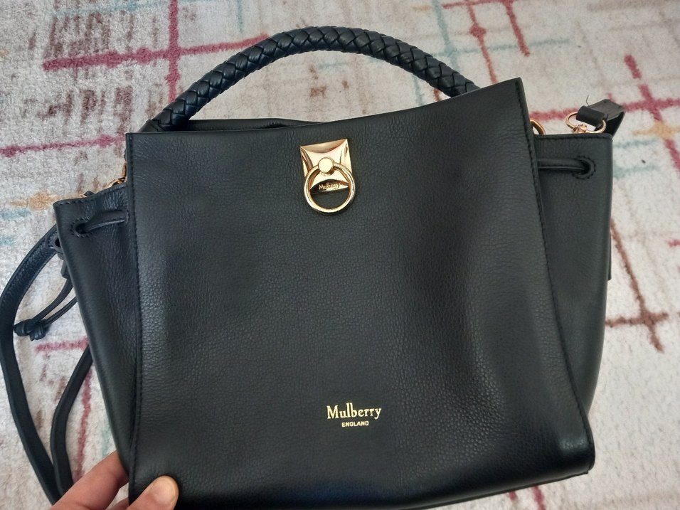 Mulberry marka siyah deri kadın çanta, tokalı ve parlak baskılı desene sahip. Örgü saplı ve şık altın detaylı, modern klasik iş stili için uygun.