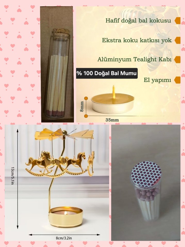 1 ADET Mum ısısıyla dönen atlıkarınca 1 ADET Doğal Bal Mumu 1 ADET Özel şişede kibrit 1 ADET Stok durumuna göre hediyelik kağıt çanta ( stok durumu desen değişikliği olabilir) SON FİYATTIR MALZEME YAPIMI SÜRÜYORSA 1 HAFTADA TESLİM EDİLİR STOK TÜKENDİ İSE STOK YENİLENMESİ 15 20 GÜN SÜRMEKTEDİR. TANITIM İLANIDIR SATIN ALMA İŞLEMİNİ BU İLANDAN YAPMAYINIZ. YENİ İLAN AÇILIR