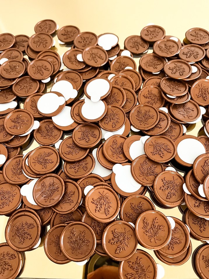 250 adet kendinden yapışkanlı 25mm ölçülerinde bakır renkli zeytin dalı mühür… hediye paketi üzerine veya organizasyon süslemerinde kullanılabilir davetiyeleri mühürlemek için uygundur