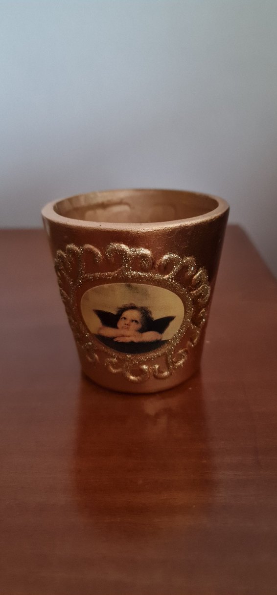 Altın renginde, üzerinde koyu renkli melek figürü ve süslü desenler bulunan klasik tarzda mumluk. ️