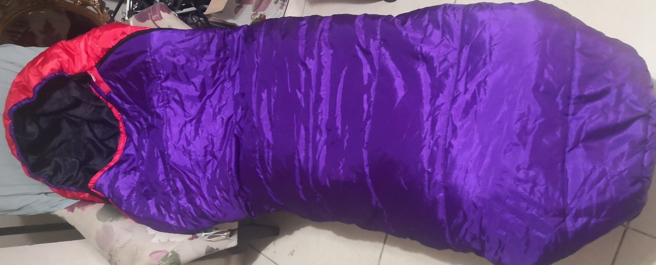 Parlak mor renkte, desensiz ve pürüzsüz yüzeye sahip mumya tipi uyku tulumu özelikleri ikinci görselde.
