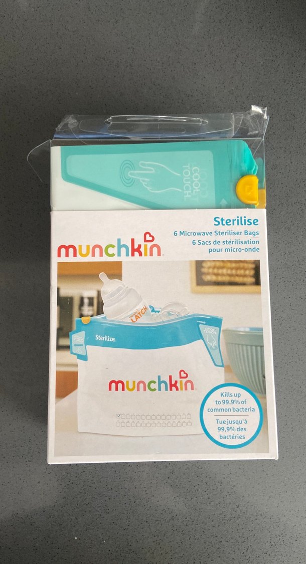 Munchkin'in turkuaz mikrodalga sterilizasyon çantaları, 6'lı pakette ve %99,9'a kadar bakteriyi öldürür. Güvenli süt saklama için idealdir. İçinden sadece 1 tane kullanıldı pakette 5 adet mevcut. 1 paketi 30 kere kullanabiliyorsunuz içine aventin 3 küçük biberonu sığıyor.