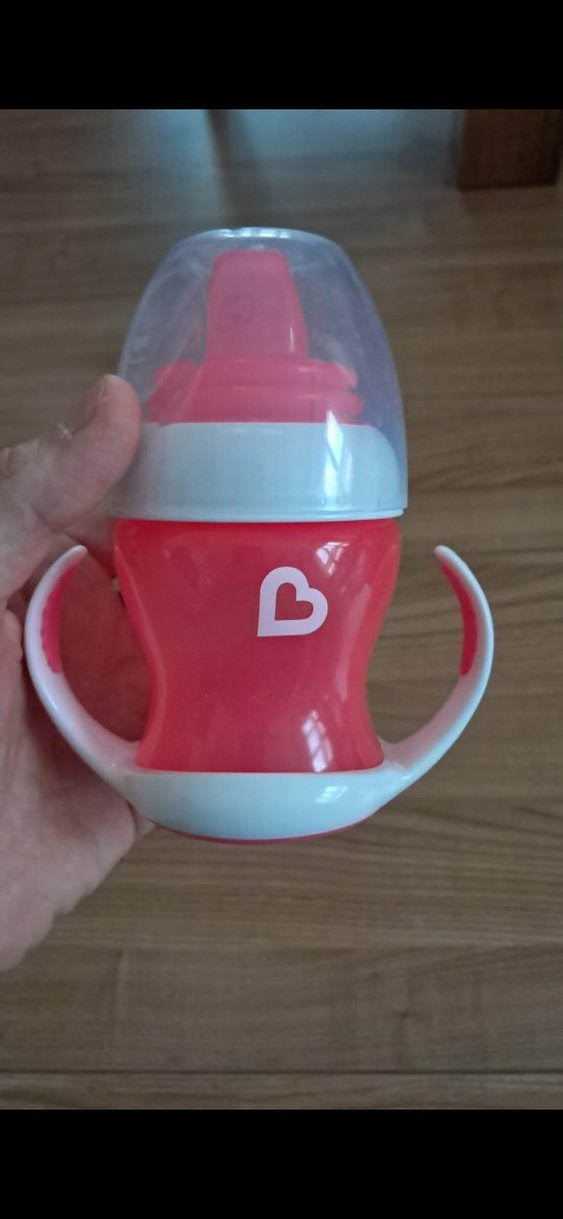 Renkli pembe bebek biberonu, ergonomik tutma kolları ve koruyucu kapak içerir. Kolay kavrama ve güvenli besleme sağlar.