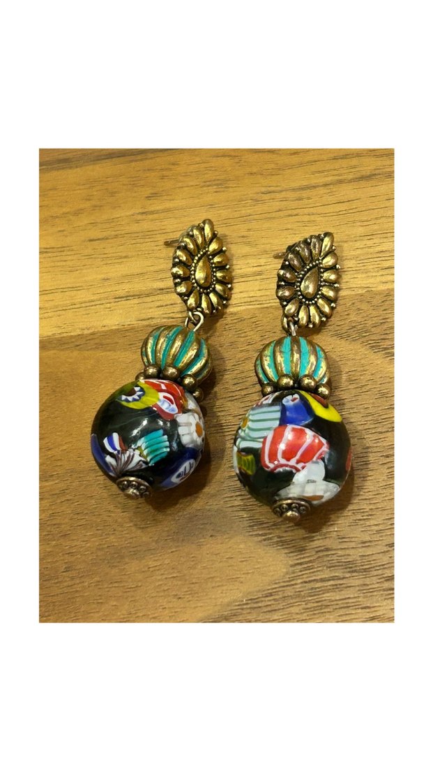 Uzun ve renkli boncuklu desenlere sahip bohem tarzda küpeler, romantik akşamlar için ideal. Canlı renkler ve detaylı tasarım içerir.