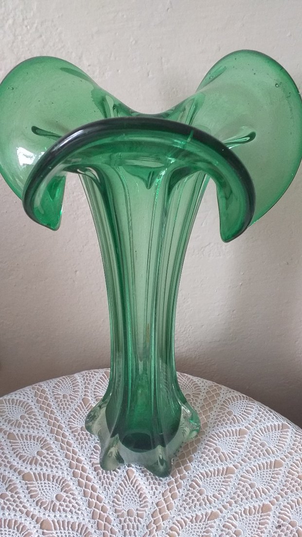 Parlak yeşil camdan yapılmış, geniş ve kıvrımlı ağız yapısına sahip dekoratif vazo. Hicbir kusuru yok.
