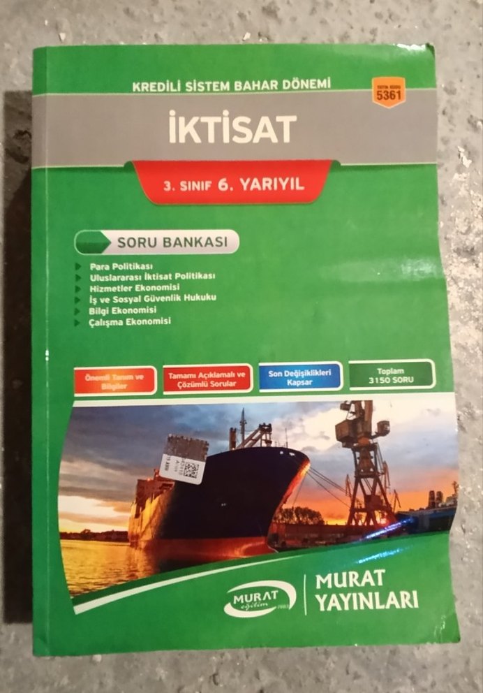 Murat Yayınları tarafından 3. sınıf 6. yarıyıl için hazırlanmış iktisat soru bankasıdır. Para politikası, uluslararası iktisat, çalışma ekonomisi gibi konuları içerir. ---- Özet konu anlatımı vardır içindeki dersler SORU BANKASI Para Politikası Uluslararası iktisat Politikası Hizmetler Ekonomisi iş ve Sosyal Güvenlik Hukuku Bilgi Ekonomisi Çalışma Ekonomisi