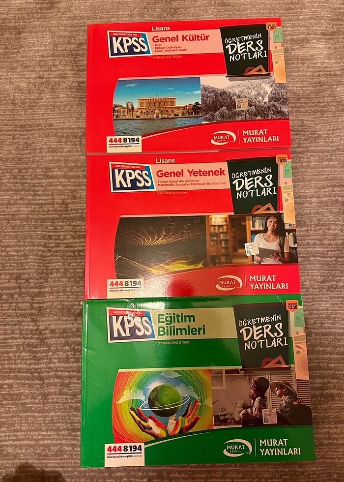 Murat Yayınları KPSS ders notlarını içeren hazırlık kitapları. İçi Tertemizdir, hiç kullanılmadı. Genel Kültür, Genel Yetenek, Eğitim Bilimleri olmak üzere üç kitaptan oluşuyor set.