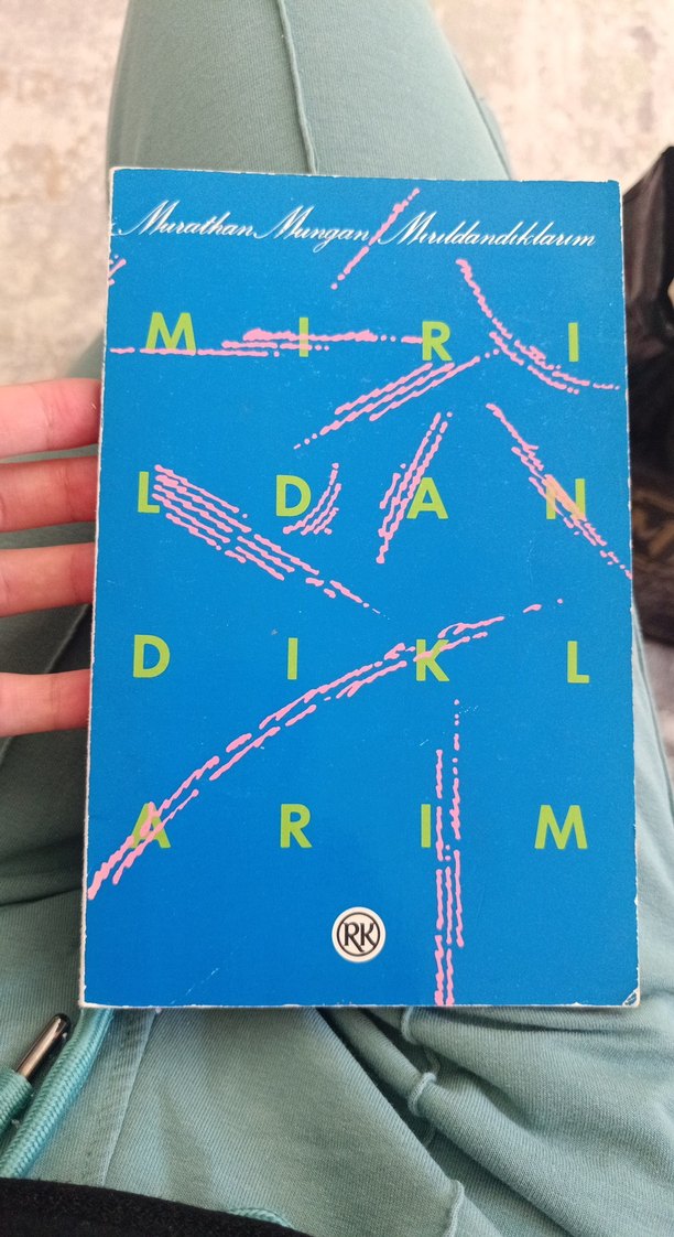 Murathan Mungan'ın 'Muldandıklarım' adlı romanı, mavi kapak üzerinde pembe ve sarı soyut desenlerle dikkat çekiyor.