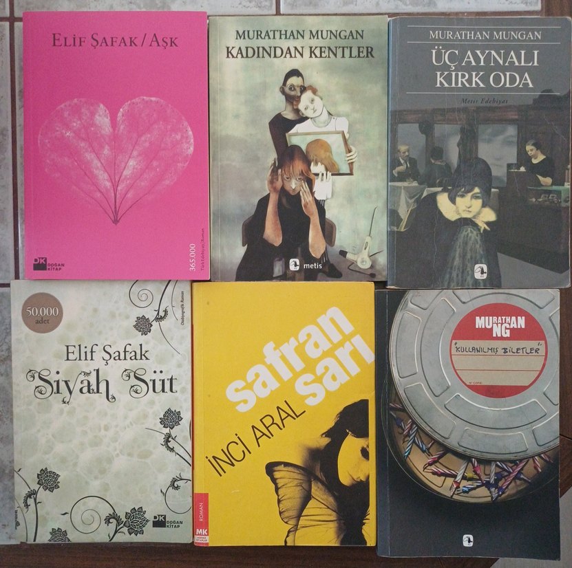 Murathan Mungan, Elif Şafak, İnci Aral ve diğer yazarların kitaplarından oluşan set. 'Kadından Kentler,' 'Aşk,' 'Safran' gibi eserler içerir.