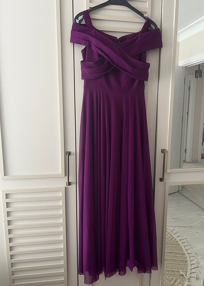 Bir kez giyildi. Kusursuzdur temizdir. 160boy 50kilo ile giydim. Gizli askıları kendim yaptırdım gözükmesini istemiyorsanız içeri itebilirsiniz ya da terzide çıkarttırabilirsiniz ama sakladığınızda hiç gözükmüyor zaten. Kumaşı görebilmeniz için yakın resim koydum
