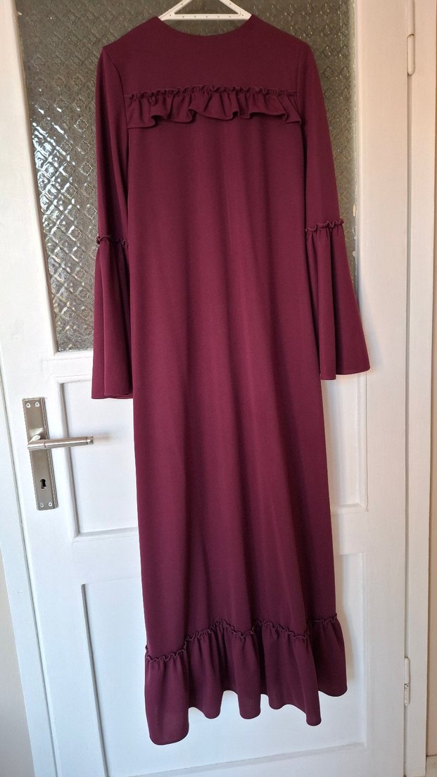 Diger markasının mürdüm rengi, bohem tarz uzun kollu, yüksek yakalı, bol kesim ve drapeli elbisesi. Günlük kullanıma uygun, modest şıklık sunar. Fotoğrafta bordo gibi dursada mor / mürdüm rengidir.